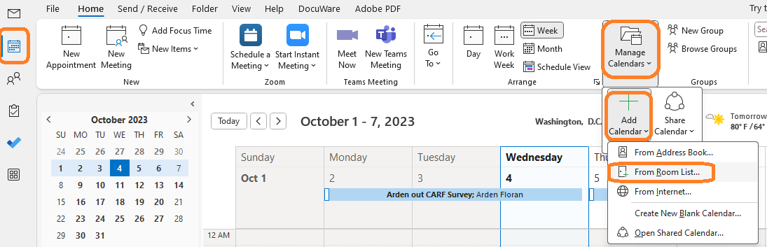 - Click on the Add Calendar button on the ribbon, then select From Room List on a drop-down menu.