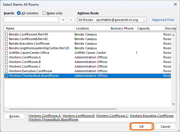 - Select the desired room from the list (i.e. double-click on each one you'd like to add), and click Rooms, then OK